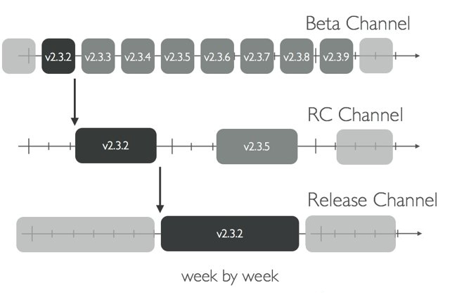 我们有三个发布 Channel:Beta、RC、Release,作用各有不同。例如 Beta Channel,主要用于一些新特性的提前发布,这里面可能会多少有点缺陷,所以一定要控制人数,并且是那些喜欢尝鲜的用户,他们会用的比较彻底。而 Beta Channel,可能每天都有版本更新,会有一些用户喜欢跟着 Beta 版。而这些新的特性如果用户反馈不错,并且没有什么严重的问题,会进入近一次 RC(Release Candidate),这个量很大了,大概能占到我们每日活跃用户的十分之一到五分之一,这里面的功能在没有意外的话,是正式发布的功能了,需要注意的是,不是每个 Beta 都会变成 RC。而 RC 在发布几天之后,如果一切正常,会切换为 Release,Release Channel 一般会在之内,让绝大多数活跃用户升级完毕,这个时候,如果程序有 bug,影响非常大了。