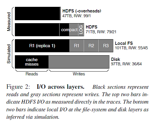 Figure 2描述了每一层的I/O构成,解释了在FM系统对外请求中读占主导,但是由于logging/compaction/replication/caching导致写被严重放大。