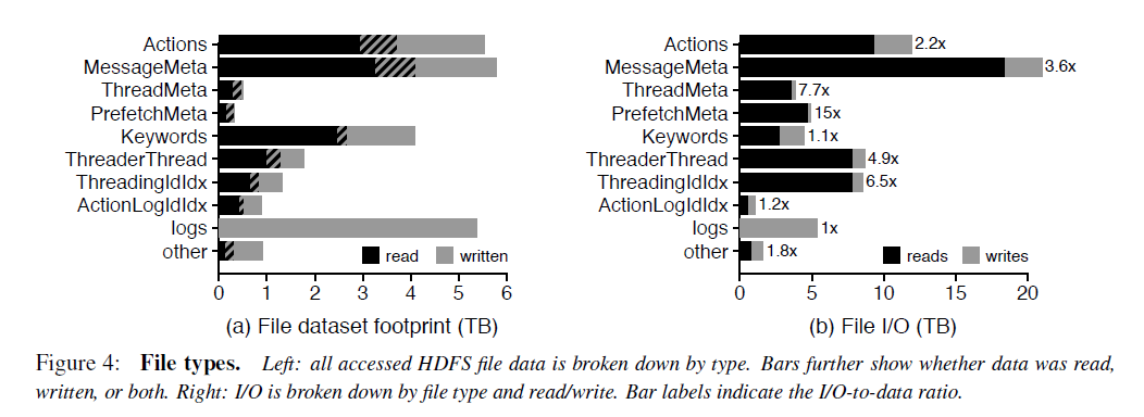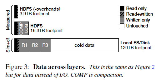 另外Figure 3从I/O数据传输中真正业务需求的数据大小来看各个层次、各个操作引起的I/O变化。除了上面说的,还发现了整个系统终存储在磁盘上有大量的cold data(占2/3),所以需要支持hot/cold数据分开存储。