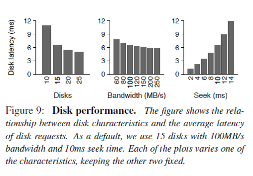 下面考虑怎么架构能够加速这个系统了。目前Facebook的HBase系统每个Node挂15块100MB/s带宽、10ms寻址时间的磁盘。Figure 9表明:a)增加磁盘块数有点用;b)增加磁盘带宽没啥大用;c)降低寻址时间非常有用。