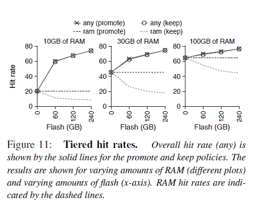 由于少部分同样的数据会被经常读取,所以一个大的cache能够把80%左右的读取操作拦截而不用触发磁盘I/O,而且只有这少部分的hot data需要被cache。那么拿什么样的存储介质做cache呢?Figure 11说明如果拿足够大的Flash做二级缓存,cache命中率会明显提高,同时cache命中率跟内存大小关系并不大。