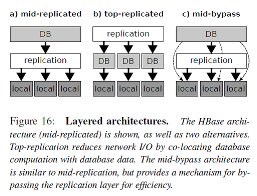如Figure 16所示,一般分布式数据库系统分为三个层次:db layer/replication layer/local layer。这种分层架构的大优点是简洁清晰,每层各司其职。例如db layer只需要处理DB相关的逻辑,底层的存储认为是available和reliable的。