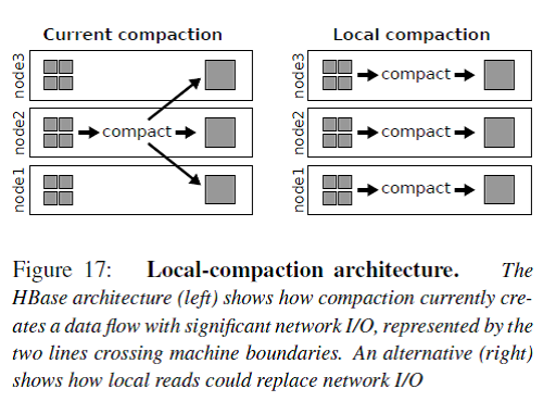 Figure 17展示了local compaction的原理,原来的网络I/O的一半转化成了本地磁盘读I/O,而且可以利用读cache加速。我们都知道在数据密集型计算系统中网络交换机的I/O瓶颈非常大,例如MapReduce Job中Data Shuffle操作是耗时的操作,需要强大的网络I/O带宽。加州大学圣迭戈分校(UCSD)和微软亚洲研究院(MSRA)都曾经设计专门的数据中心网络拓扑来优化网络I/O负载,相关研究成果在计算机网络会议SIGCOMM上发表了多篇论文,但是由于其对网络路由器的改动伤筋动骨,后都没有成功推广开来。