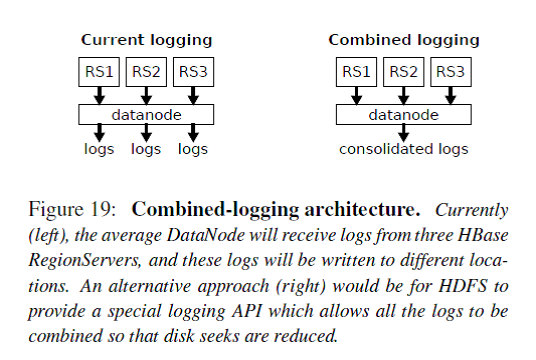 Figure 19展示了combined logging的原理。现在HBase的多个RS会向同一个DataNode发送写log请求,而目前DataNode端会把来自这三个RS的log分别写到不同的文件/块中,会导致该DataNode磁盘seek操作较多(不再是磁盘顺序I/O,而是随机I/O)。Combined logging是把来自不同RS的log写到同一个文件中,这样把DataNode的随机I/O转化成了顺序I/O。