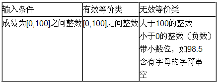 1) 输入条件规定了取值范围或值的个数的情况下,可以确定一个有效等价类和两个无效等价类,如合格成绩取值范围为[60,100],则范围内取值为有效等价类,范围外<60和>100为无效等价类