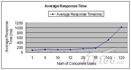 下图为某个web服务在不同并发虚拟用户数下平均响应时间曲线图,由图可看出,平均响应时间随着并发虚拟用户数的增加而增加。在用户数从50到100,平均响应时间开始比较大幅度地增长,此时很有可能某个系统资源出现了瓶颈,当然前提条件是在被测应用程序没有出现错误的情况下。此时可以进行调优,但要保证每次只改动一个参数值,然后再次执行相同测试用例,并与之前的结果进行对比,选取结果优的参数配置。