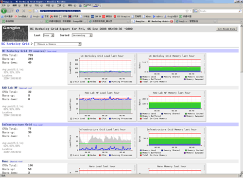 Ganglia是一个跨平台可扩展的,高性能计算系统下的分布式监控系统,如集群和网格。它是基于分层设计,它使用广泛的技术,如XML数据代表,便携数据传输,RRDtool用于数据存储和可 视化。它利用精心设计的数据结构和算法实现每节点间并发非常低的。它已移植到广泛的操作系统和处理器架构上,目前在世界各地成千上万的集群正在使用。它已被用来连结大学校园和世界各地,可以处理2000节点的规模。