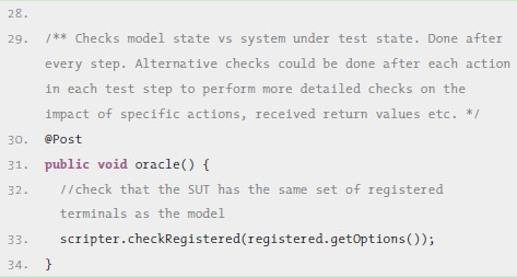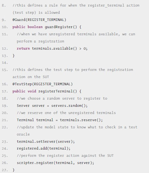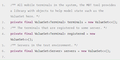 为了给这个概念提供一个具体的理解,首先我们举一个简单的例子。这里所说的例子使用OSMO Tester MBT生成器的符号,它基于Java编程语言。这种情况下,测试模型是使用标准的Java编程语言结构编写的,但却被设计成被另一个称作测试生成器的程序以不同的方式执行,以生成测试用例。有时候,这种模型被称为模型程序。