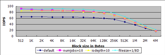实测结果,在单线程同步IO的情况下(下图深蓝线),也是65,在多任务(紫线)或者使用异步IO(黄线)的情况下,由于操作系统IO调度,IOPS能够达到80到100之间。如果进行读写操作的文件远远小于SATA磁盘大小,缩小了存储单元寻址范围,减少了全磁盘寻道时间,也能提高IOPS,例如,测试文件大小占磁盘大小的1/8的时候,IOPS高在90左右(浅蓝线)。
