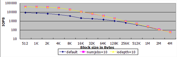 测试用的SSD硬盘,在单线程同步IO的情况下,IOPS多能够达到9000左右(下图深蓝线),在多任务(紫线)或者异步IO(黄线)的情况下,多能够达到40000-50000之间。由于构造原理不同于传统磁盘,减小测试文件大小并不能明显提高IOPS。