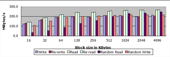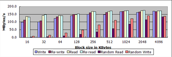数据块大小在512KB-4MB之间,吞吐量125-140MB/s,如果数据文件大小超过可用内存,降低到80MB/s以下