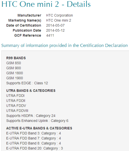 根据GCF上的信息显示,HTC One Mini 2将支持GSM 1900/1800/900/850MHz,但不支持LTE。