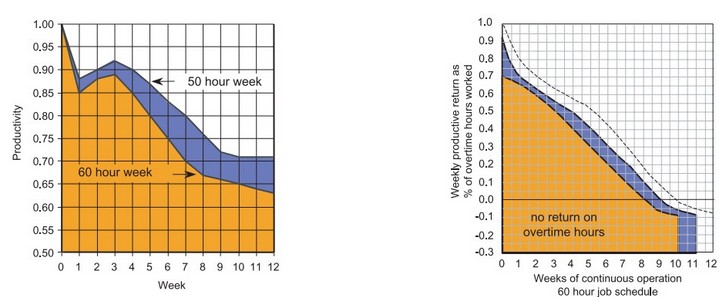 当每周工作时间超过60 小时,并持续超过两个月,生产力下降的累积效应将使完工日期推迟,而人数相同但每周只工作40 小时的团队执行同样工作,甚至还会更早完工。