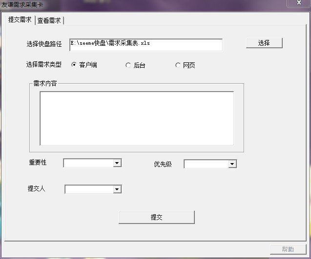 主要是适合产品和运营人员使用,每提交一个需求需要对于需求进行评估;提交后在快盘的excel里添加了一条新的记录,同时记录了提交需求的人和提交需求的时间。