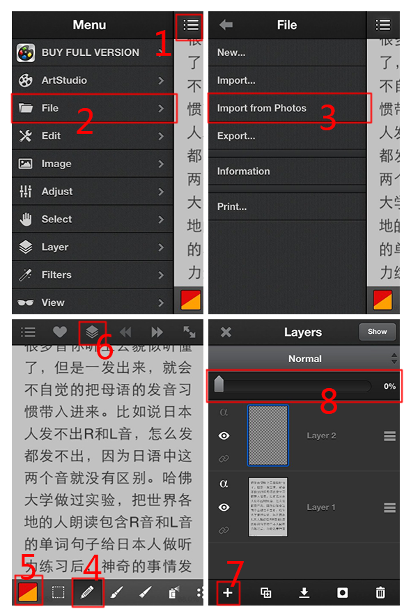 用户来了之后,按手机类型安装好画图软件,同时将书本页面导入到已经安装到用户手机里的画图软件中,在测试过程中不同的翻页操作使用不同的书本页面(为了后期统计方便),以iPhone端的ArtStudio Lite为例,操作如下: