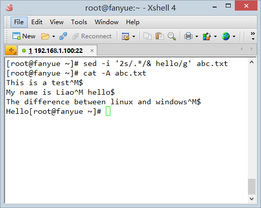 得出结论:sed会把文件中的^M当作文件内容来处理,因此如果用sed处理windows下创建的文本文件,很有可能在处理之后显示时出现讨厌的^M. 关于其他的文本处理器如何处理windows的换行符,还有待进一步研究。