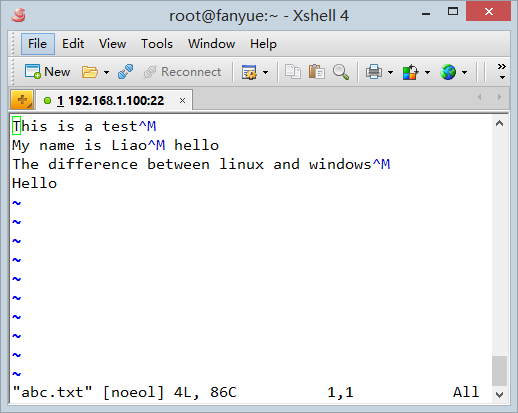 windows下创建的文件换行符为^M$,但后一行结尾没有换行符