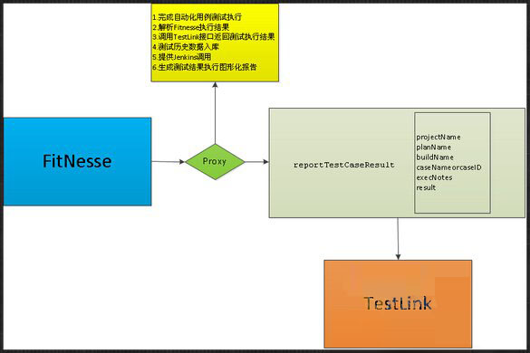 在这里我通过一个代理proxy来完成该任务,该代理需要完成Fitnesse测试执行结果的解析,测试用例ID的解析,然后完成TestLink接口的调用