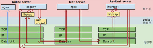辅助服务器intercept进程通过pcap抓取测试机应用程序的响应包,将头部抽取后发送给线上的tcpcopy进程,完成一次请求的复制。