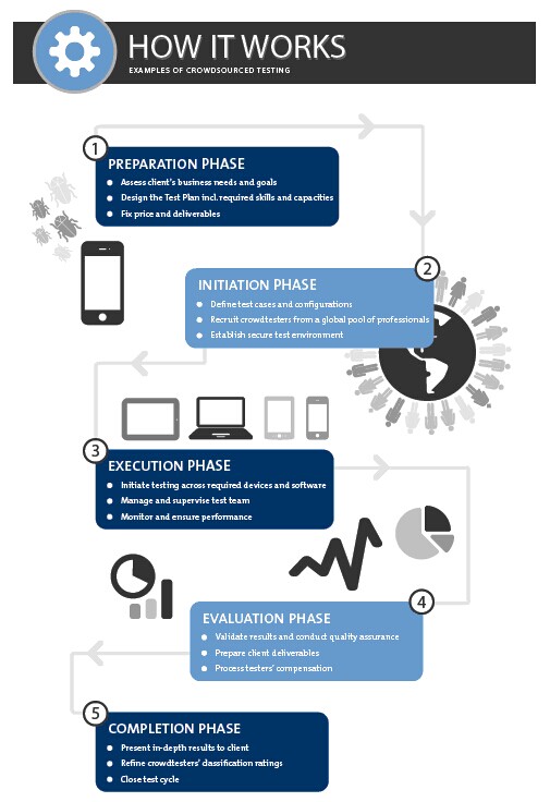 大多数众包测试公司为测试周期提供平台和项目管理框架,包括管理政府和法律结构。群体测试公司还分配一个负责测试过程的合适的项目经理。众包软件测试服务的消费者方面,客户指定他们希望执行的测试类型和测试系列,测试员的技能和个人信息,软件必须在上面进行测试的设备的类型和配置等。客户公司也可以咨询群体测试公司确保测试充分。供应商方面,测试人员完成一个配置文件,表明他们的背景和资历,他们有权访问的设备和平台,以及其他相关细节。测试人员有时需要参加评估或试验项目作为他们成为社区成员的先决条件。在项目启动之前,会给测试人员提供详细的测试计划,示例场景,工具,脚本和说明。在执行过程中,测试人员记录下他们的观察,并根据观察报告的数量和质量被评分,这与他们的薪酬和激励结构直接挂钩。社区结合协作和竞争,成员合作找出解决方案说明问题。论坛促进知识管理,网络以及bugs或相关问题的讨论;评分系统可以识别所做的出色工作,这有助于参与者获得信誉并完善自己的职业生涯。群体测试应被视作产品发布前的额外补充测试而不是一个独立的活动及一个组织内部测试团队的替代品。这对在生产前发现误差UI和配置缺陷很有效。