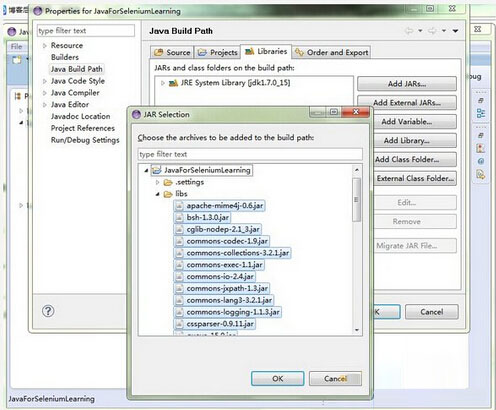 把libs文件夹下的jar包全部添加上,再添加selenium-java-2.42.2和selenium-java-2.42.2-srcs