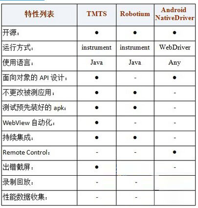 其它的很多功能,这里不一一说明了。通过下面的表,列举TMTS,Robotium和Android Native Driver的特性与区别。