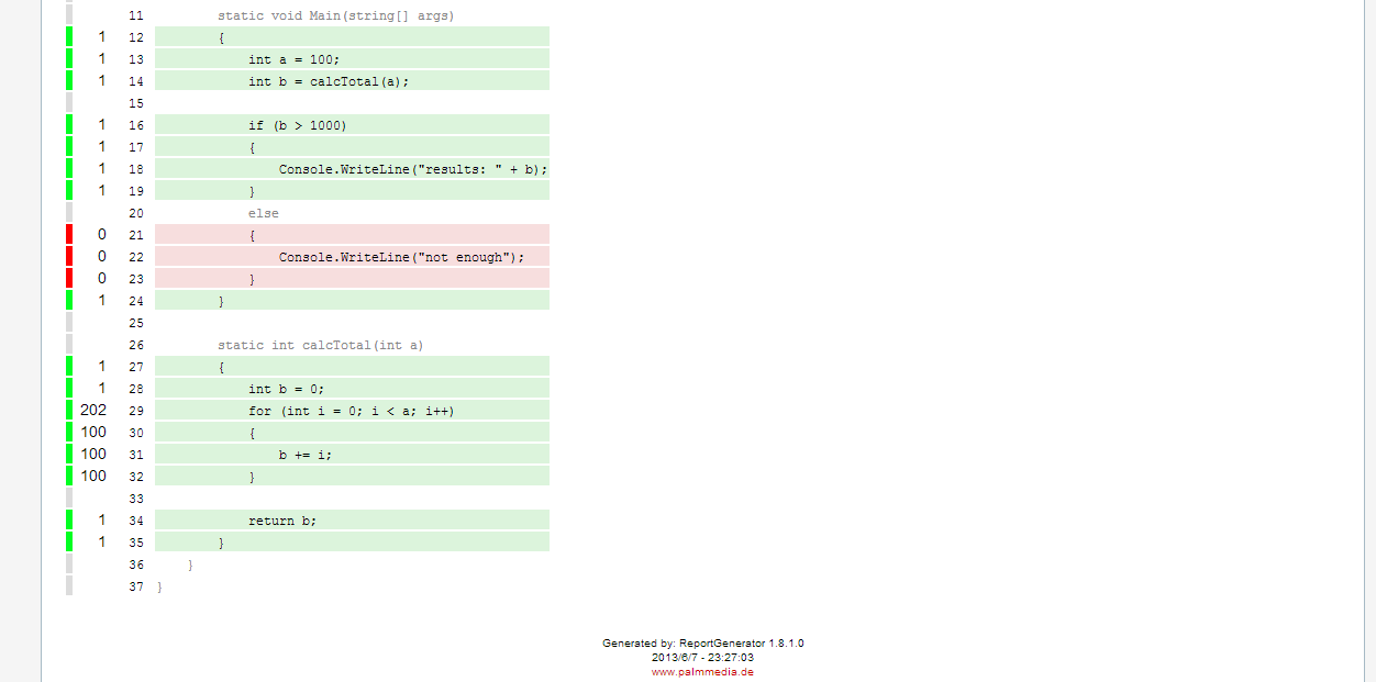 由于这里有源码,所以HTML报告里面直接显示了代码行级别的覆盖率。红色的部分是没有执行到的,绿色的是被执行到的。加起来是可覆盖(coverable)行。这里的概念都是比较通用的,和其他语言的覆盖率也是一样的。