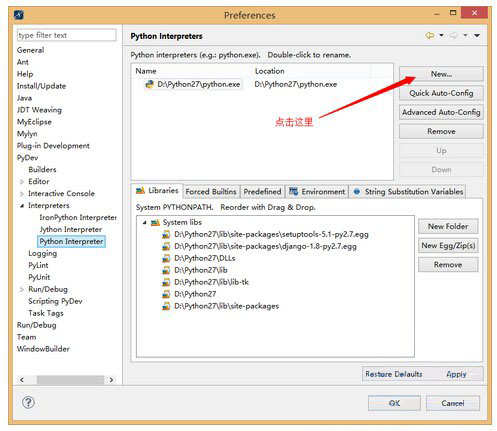 在window --> preferences --> PyDev --> Interpreters - Python Interpreter 中点击new,然后找到你的python安装目录即可。