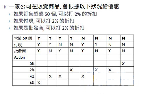 因此根据这样的想法, 哪一种黑盒测试的方法比较合适呢? 目前看起来应该是 Decision Table Testing. 因为它会将你想的测试状况, 明确清楚的列出来, 这时候别人可以检视你的思考逻辑. 以下是使用 decision table 测试方法的范例: 说明在这样的商业规则下, 你需要考虑哪些测试 scenario. 这样的表达方式, 别人可以快速知道你是怎么思考, 是否有不足的地方.