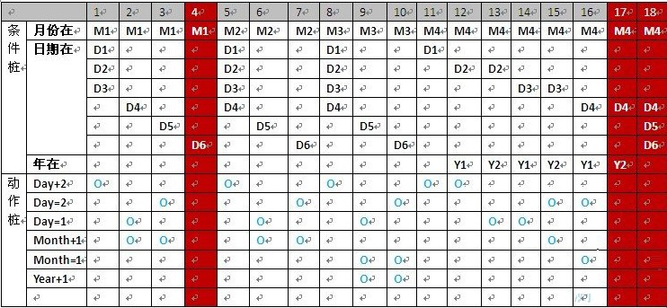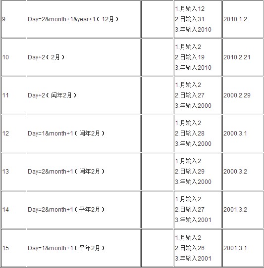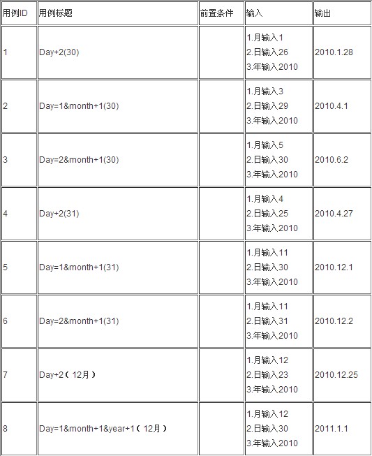 假设某程序有三个输入变量year 、month、day(month、day和year均为整数值,并且满足:1≤month≤12、1≤day≤31和1981≤year≤2050),分别作为输入日期的年份、月份、日,通过程序可以输出该输入日期在日历上隔的日期。试用判定表法设计该程序正确输入条件下的测试用例。