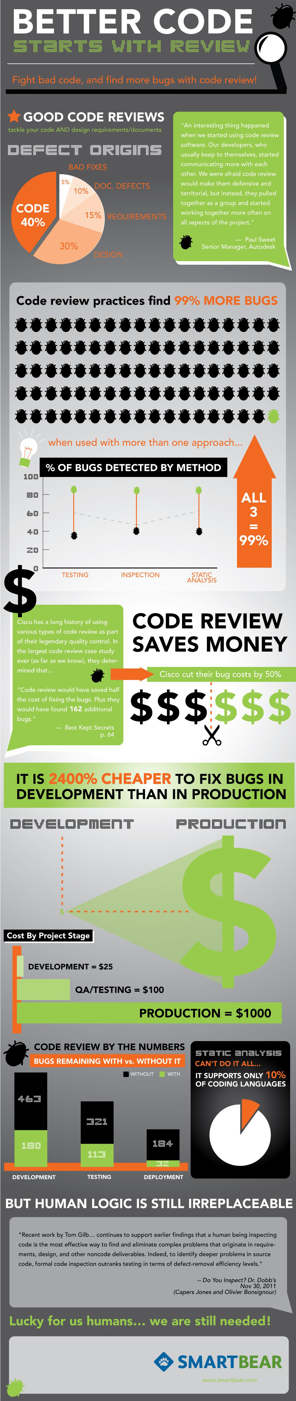 第三种可能性误解,开发者利用静态分析工具来查找bug,以致代码审查工作成为不必要性。然而事实并非如此,Capers Jones,一位软件质量度量领域的巨人,曾发表过一篇文章“结合视察、静态分析和测试能消除影响效率缺陷的95%”,这种三叉戟式的方法能确保软件质量。