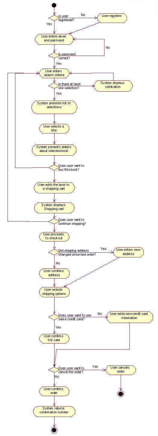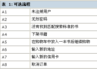 除了基本流程以外,还有许多可选流程。例如,第一个可选流程描述了当用户是一个新的用户时所发生的事情(不是在线书店的已注册用户)。在基本流程中,用户经常拥有一个用户ID和密码。相反,可选流程 1 描述了当第一次用用户需要注册并提供顾客数据时的情况。可选流程的另一个例子是无效的密码。用户输入了错误的密码,系统显示错误信息。