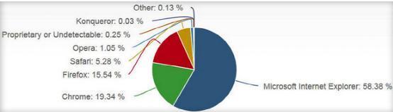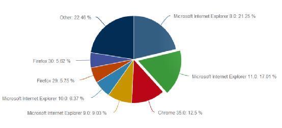 而在对浏览器版本的统计中,IE 58.38%的市场份额中有21.2%和17%的份额分别为IE 8和IE 11所占据,相比之下Chrome 35的份额则为12.5%。