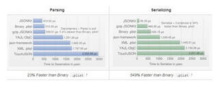 JSONKit的性能远优于JSON-Framework(即SBJSON),JSONKit使用起来也非常简单,表现性能比苹果iOS 5.0中的NSJSONSerialization还要好,速度比NSJSONSerialization快上25% to 40%,已经是非常大的一个差距了