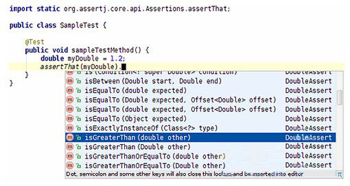 从这能看出,AssertJ提供了比JUnit和TestNG丰富得多的断言集合。像后一个assertThat("some text")例子显示的,你甚至可以将它们串在一起。还有一个非常方便的事情是,你的IDE能够根据被测对象的类型,自动为你提示可用的方法。举例来说,对于一个double值,当你输入“assertThat(myDouble).”,然后按下CTRL + SPACE(或者其它IDE提供的快捷键),IDE将为你显示可用的方法列表,例如isEqualTo(expectedDouble)、isNegative()或isGreaterThan(otherDouble),所有这些都可用于double值的校验。这的确是一个很酷的功能。