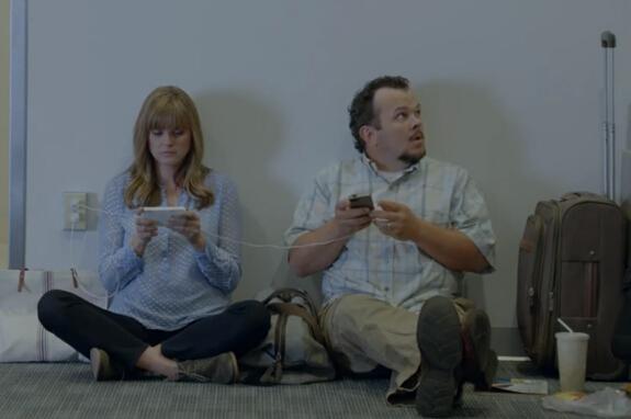 这则新广告发布在三星美国移动公司的YouTube页面上,与此前三星在美国黄金时段发布的攻击iPhone的电视广告风格类似。这则新广告显示,iPhone 5S用户在机场很多地方都接着电源线,并暗示iPhone用户不得不在“脏乱的地毯和浴室”里也接着电源,确保手机电量能够使用一整天。某中一个场景,一名iPhone用户靠着机场的墙坐着,称新款手机即将发布,旁边另外一个则说,希望它的手机电池能够更好。
