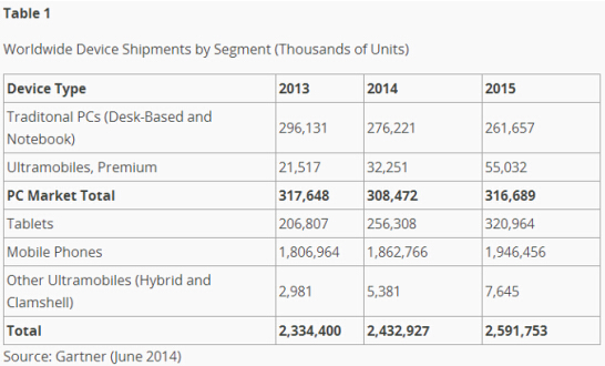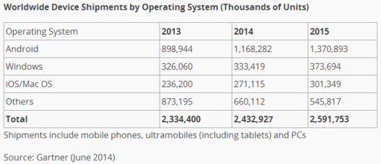 在新的报告中显示,预计在2014年度传统个人PC、平板电脑以及智能手机的出货量将达到24亿台。在24亿台中,智能手机和平板电脑占据了88%的份额,而这其中Android系统设备又占据了绝大多数。这一数据与2014年相比增长了4.2%。