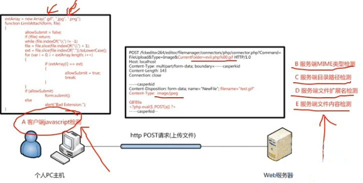 验证方式可能有:客户端JS检测、服务器MIME类型检测、服务器目录路径检测、服务器文件扩展名检测、服务器文件内容检测。