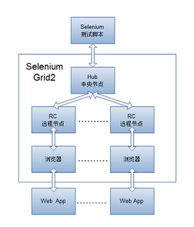 Selenium Grid 允许用户将测试案例分布在几台机器上并行执行。用户可以在一个集中控制点控制不同的环境。在不同的浏览器 / 系统组合上面更为容易的运行测试案例。允许用户更多的利用虚拟资源减少了维护测试环境的成本。Selenium Grid2 很好的支持了 WebDriver。利用原有的 WebDriver 脚本和 Grid 技术可以将不同的测试用例分布在不同的机器或虚机上,在特定的浏览器版本上运行,自动地启动关闭分析工具,统一地保存测试结果。Selenium Grid2 的机制如图 1,启动一个中央节点(Hub),然后启动多个远程控制节点(rc),启动 rc 时告知 Hub 的位置,这样这些 rc 可以注册到 Hub 上,测试程序与 Hub 通讯,当测试被并发地发给 Hub 时,Hub 会自动将这些测试命令分发给已经注册的 rc,rc 接到命令后执行测试。