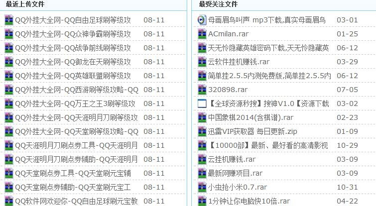 1.游戏外挂。上图为某网盘产品当中截取的近上传文件和受关注文件,其中近上传文件中,所有的内容皆为游戏外挂,而在热门文件当中,也是由外挂以及其他软件组成。很明显,外挂是损害了游戏厂商的利益的。