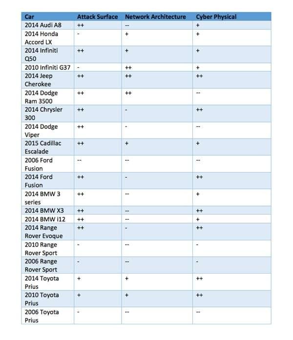 在这两个研究人员的分析中,有3辆汽车被评为“容易被破解”的:2014款英菲尼迪Q50和吉普Cherokee,以及2015款凯迪拉克Escalade。全部结果归纳如下表,我们能看到2010和2014款丰田普锐斯情况也没好到哪儿去。