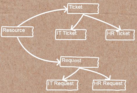 在这个案例中我将描述一个虚构的资源管理系统,其中资源指的是可指派给其任务的某个人。可以为某个资源指派一个HR票据(ticket)或者IT票据,也可以为某个资源指派一个HR请求或IT请求。资源经理可以记录某个资源处理某项任务的预计时间,而资源本身可以记录他们在某个票据或请求上工作的实际时间。