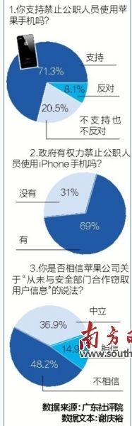 苹果公司日前承认,可以通过一项未公开的技术获取iPhone用户的短信、通讯录和照片等个人数据,但否认为情报部门服务。笔者昨日从广东省现代社会调查与评价研究院(下称“广东社评院”)获悉,该院上周联合调研吧和新浪网,对1061名网民进行的“公务员应否禁用苹果手机”在线调查结果显示,对于禁止公务人员使用苹果手机的提议,有71.3%的被访者表示支持。