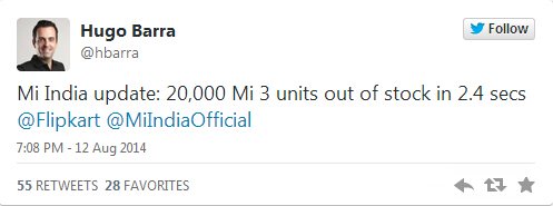 小米全球副总裁雨果·巴拉(Hugo Barra)在Twitter上公布了这一消息:20000部小米3在印度市场于2.4秒内售罄。