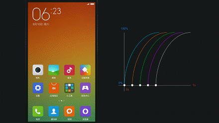 动画方面,小米还是给到了我们以惊艳。小米官微之前放出的高数算式内涵图,实际上指的是MIUI 6的全新动画算法。这个动画算法存在明显的先后顺序与速度差异感,这种动画速度上的差异打破了扁平界面带来的枯燥乏味,应用以一种优雅的方式动态呈现,美观而不生硬,同样可以解决扁平化带来的单调感。