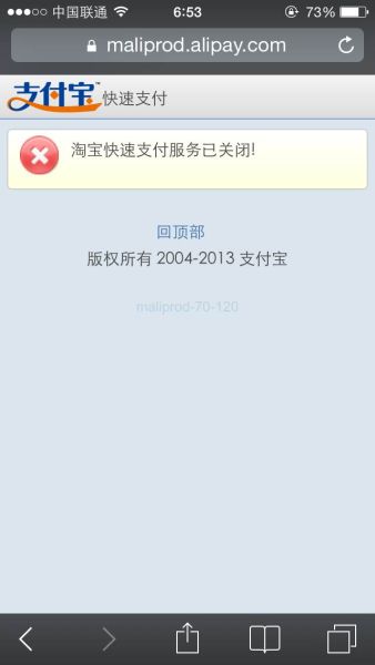 早间,用户登录手机淘宝购买彩票时发现,之前一直正常使用的快速支付功能已无法正常使用,并直接跳转至页面提示“淘宝快速支付服务已关闭”,据该用户反应此状况已至少持续达数小时,而目前仍未恢复正常。