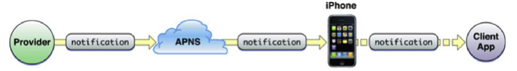 Apple为IOS提供了很完美的推送方案,其基本原理是Apple提供了自己的推送服务器,叫APNS(Apple Push Notification Service,苹果推送通知服务器)。而客户端设备(IPhone、IPad等)直接与APNS建立长连接。不过向客户端设备发送的消息并不是由APNS产生的,而是在需要发送消息的用户自己提供的服务器(称为Provider)中产生的,然后Provider将消息传送给APNS,后由APNS将消息传送给客户端设备。也是说,消息开始由Provider产生,然后Provider将消息传送给APNS,后再由APNS传送给客户端设备。消息传递的过程如图1所示。