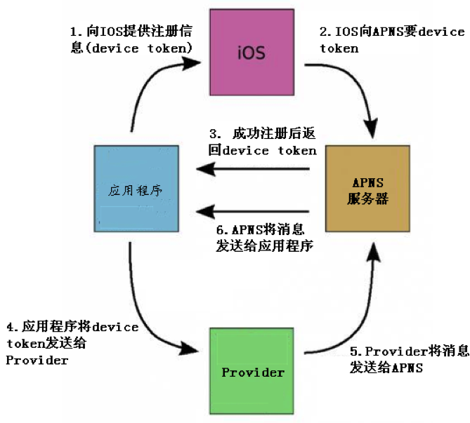 在发送消息到客户端设备接收到消息的过程中,始终伴随这一个令牌的传送(device token)。要想使用APNS提供消息服务,应用程序需要先向IOS注册需要提供的一个必要的信息是与当前设备有关的device token,IOS在接收到devicetoken后,会向APNS查询这个device token是否在APNS上注册了(所有的IOS设备在第一次使用时都需要向苹果服务器注册一个账号,否则无法从AppleStore下载应用,当然更无法使用推送服务了),如果已经注册,APNS会直接向应用程序返回这个devicetoken。应用程序获得这个devicetoken后,表示APNS已经允许向自己推送消息了,接着还需要将该device token发送给推送服务器(Provider)。到这里应用程序已经成功将自己注册到APNS中了。现在可以通过Provider产生要推送的消息,然后Provider会将消息发送给APNS服务器,后APNS服务器会直接向应用程序发送消息。这个过程比较复杂,不过看一下图2的描述会对这一过程更加了解了。每一个流程描述前面的数字表示发送的时间先后顺序。
