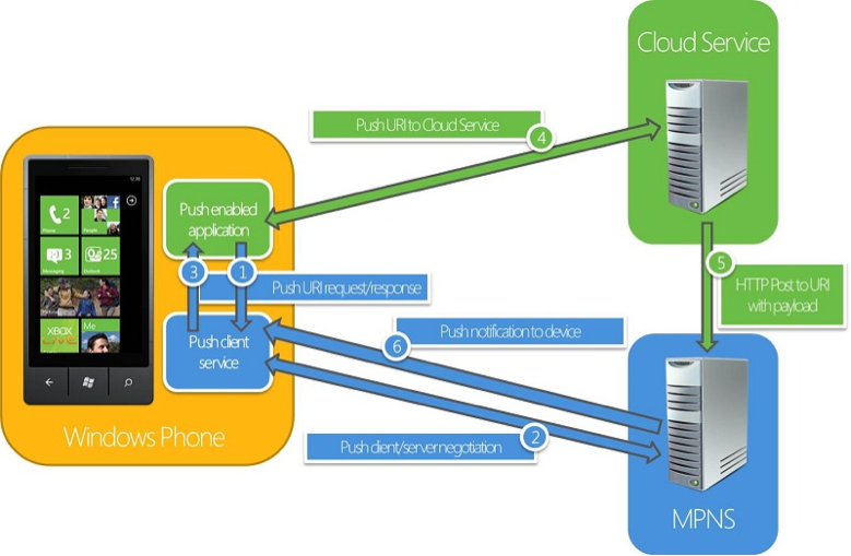 第4步:如果需要推送消息,Cloud Service会将消息发送到MPNS,然后MPNS会将消息发送给Push Client Service,后由Push Client Service将消息传送给应用程序(⑤、⑥和③)。