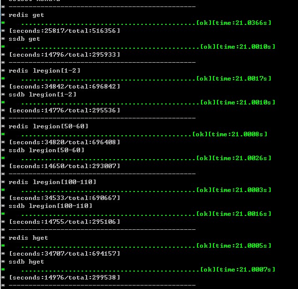 幸好ssdb是兼容redis的部份协议,所以直接用redis client库可以进行一个压力测试.以于针对Redis和ssdb的几个读操进行一个简单的性能测试对比,这个测试不是直接在本机调用Redis和ssdb. 而是通过一个程序在别的服务器上调用.测试指令(get,hget,lregion)以下是测试结果截图